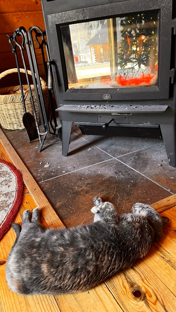 We also started watching cat documentaries so we could learn how to deal with her erratic behavior. Evidently, nightly cats will go into hunting mode just around dinner time. She gets absolutely terrifying running through the cabin, up and down the stairs seemingly participating in some kind of war against the demons, attacking anything that gets too close – claws out! So we have learned to let her go outside and let off the steam there. It has worked pretty well except for the fact we live close to 10,000 feet in the Colorado mountains so it gets very chilly after dark. She will tolerate being outside a bit, but then is jumping up at the door letting us know she wants back in. We also learned that a cats body temperature is a bit warmer than ours – around 102 degrees Fahrenheit and she will go and curl up by our wood stove when a fire is lit, it acts like a drug. On freezing, snowy days, she will spend most of the morning there. Almost as if she has her kitty IPhone alarm set, half past five at night she begins her crazy mode again.