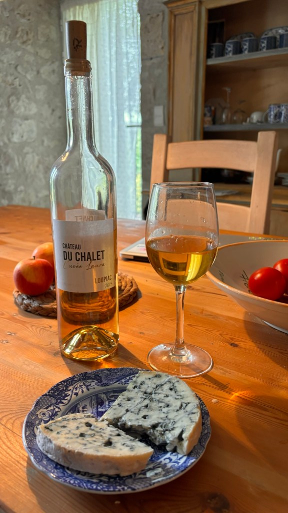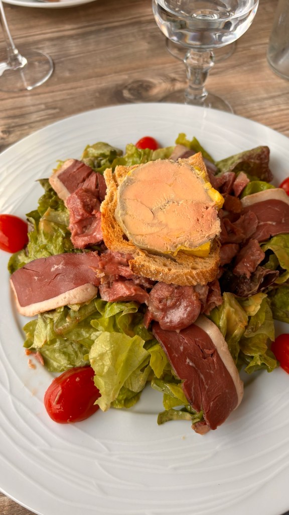 Usually we don’t eat breakfast until around 11am. So kind of late which puts our lunch/dinner late afternoon. So eating two main meals with sometimes a cheese plate later with wine. It is easy to eat healthy here because of all the fresh vegetables and fruit available. One can go to a market in every village or you can simply shop at the Inter-Marche or Lidl. If you peruse the meat aisle, you will notice some items you don’t normally see. Lupin (rabbit) is readily available as are frogs legs and beef tongue. One of my favorite meat items is duck which is canard in French. At cafe’s or restaurants it is always possible to find a salad which they serve with foie gras. I had never had it before, so I wanted to try it. It was so creamy and good.